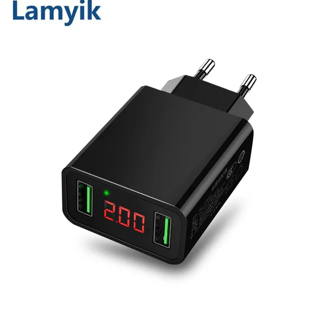 Lamyik Universal EU Plug Phone Fast Charger Digital Display Dual Port USB Adapter 2.2A for iPhone iPad Samsung Xiaomi Charging